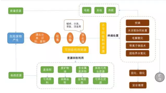 目前,我國(guó)對(duì)危險(xiǎn)廢物的處理方式主要可分為有資源回收利用和終端處置,危險(xiǎn)廢物處理全鏈條圖譜如下所示: