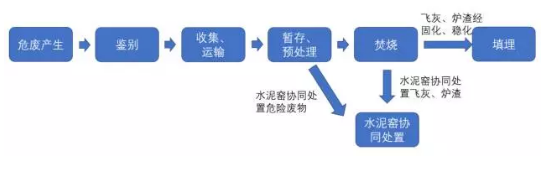 危險(xiǎn)廢物終端處置方式主要為焚燒和安全填埋,同時(shí)水泥窯協(xié)同處置、等離子體技術(shù)等也逐漸發(fā)展應(yīng)用于實(shí)際。焚燒中產(chǎn)生的飛灰和爐渣會(huì)經(jīng)過(guò)固化、穩(wěn)化等技術(shù)處理后,進(jìn)入填埋場(chǎng)。危險(xiǎn)廢物焚燒和水泥窯協(xié)同處置本質(zhì)上都屬于高溫處理技術(shù),兩種處置方法全鏈條可簡(jiǎn)化為下圖: