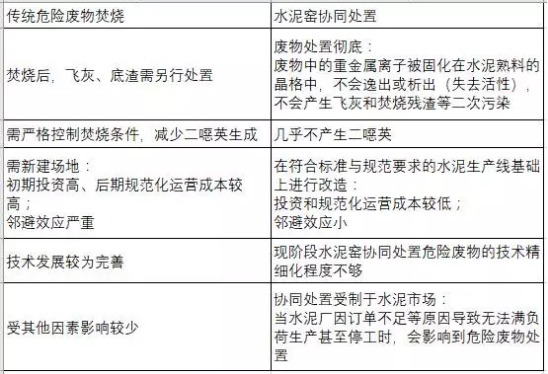 傳統(tǒng)的危險(xiǎn)廢物焚燒技術(shù)與水泥窯協(xié)同處置危險(xiǎn)廢物的兩者對(duì)比如下所示: