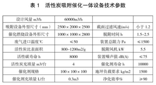 項目采用吸附濃縮+催化燃燒組合工藝,活性炭對VOCs吸附濃縮,脫附后可重復(fù)使用,脫附下來的濃縮VOCs通過催化劑電加熱實現(xiàn)低溫燃燒,達到處理污染物的目的,燃燒熱風(fēng)循環(huán)使用于活性炭脫附,達到節(jié)能目的。設(shè)備具體特性如下: