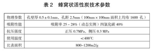 b)吸附箱采用抽屜式結(jié)構(gòu),裝填方便、便于更換。采用新型的活性炭吸附材料——蜂窩狀活性炭,與粒狀相比具有優(yōu)越的動力學(xué)性能。極適合于大風(fēng)量下使用。由于其比重為條形活性炭纖維的8-10倍,再生前吸附有機溶劑可以達到活性炭總重量的25%,具有使用壽命長,吸附系統(tǒng)運行阻力低,凈化效率高等特點。蜂窩活性炭主要技術(shù)參數(shù)如表2所示: