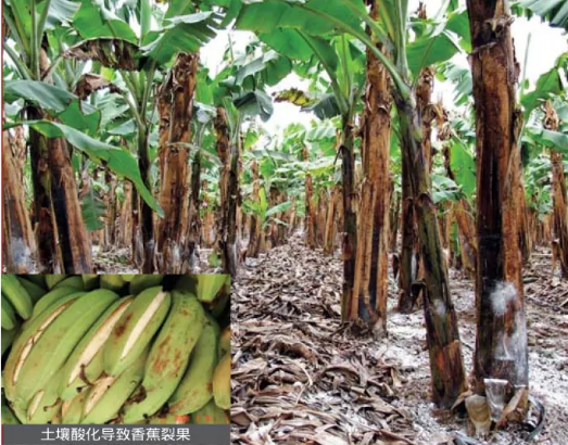 在廣西金穗香蕉公司發(fā)現(xiàn)的裂果香蕉,上億元的香蕉因此爛掉了。經(jīng)我們測試,種植香蕉的土壤很酸,特別是種植時候要挖深溝,深溝里的生土pH 值只有3 點多到4 點多,鈣鎂吸收量非常低,果皮韌性差,在水分比較多的時候,果肉膨脹得快,果皮膨脹慢,就會裂果。后經(jīng)我們的優(yōu)化肥料配方和改良土壤,給金穗公司節(jié)省1800 多萬元成本,徹底解決了裂果問題。公司也建立了一個有機肥堆肥廠,生產(chǎn)有機肥,再施加石灰,來改造酸性土壤。