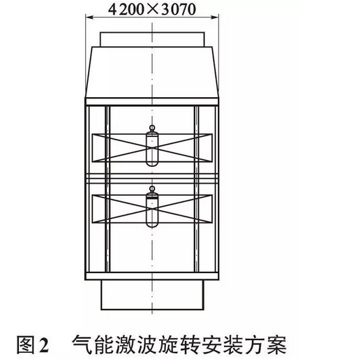 最終確定方案為在兩層受熱面中間布置2臺(tái)氣能激波旋轉(zhuǎn)吹灰器,安裝方案見圖2。