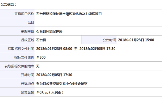 安徽省石臺(tái)縣環(huán)境保護(hù)局土壤污染防治能力建設(shè)項(xiàng)目STZF2017191A招標(biāo)公告