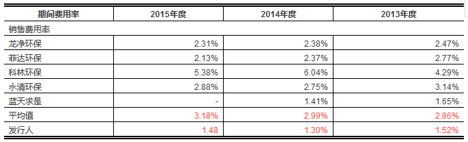 根據(jù)招股書,發(fā)行人2013、2014、2015年度前五大客戶銷售收入占當(dāng)期營業(yè)收入的比例分別為46.98%、54.33%、65.14%,呈逐年上升趨勢。同時,發(fā)行人相同期間的銷售費用分別為242.38萬元、278.80萬元、346.81萬元,對應(yīng)的銷售費用率分別為1.52%、1.30%、1.48%。與同行業(yè)上市公司龍凈環(huán)保、菲達(dá)環(huán)保、科林環(huán)保、永清環(huán)保、藍(lán)天求是等對比,發(fā)行人的銷售費用率處于明顯偏低水平,因此被懷疑調(diào)節(jié)銷售費用。