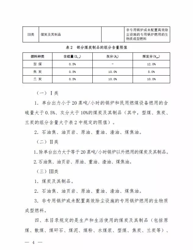 第Ⅰ類,考慮到中西部地區(qū)部分城市煤炭使用還存在規(guī)?;讲桓叩默F(xiàn)象,從鼓勵(lì)煤炭清潔利用角度,提出單臺(tái)出力小于20蒸噸/小時(shí)的鍋爐和民用燃煤設(shè)備燃用的含硫量大于0.5%、灰分大于10%的煤炭納入禁燃范圍。其中,型煤、焦炭、蘭炭的揮發(fā)分含量不能大于12%、5%和10%,對(duì)型煤的灰分含量沒有要求。