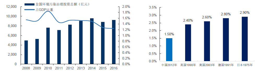 我國環(huán)境治理標(biāo)準(zhǔn)距國際先進(jìn)標(biāo)準(zhǔn)差距大,我國環(huán)保污染治理投資總額占GDP比重為1.3%,與發(fā)達(dá)國家同期2.5%的投入還有較大差距。
