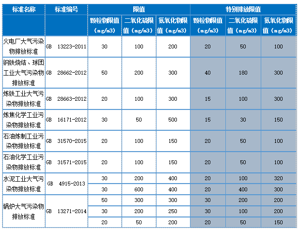 2)工業(yè)企大氣污染排放標(biāo)準(zhǔn)寬松,存在具體提升改進(jìn)空間。國家已經(jīng)著手提高工業(yè)各行業(yè)的排放標(biāo)準(zhǔn)。