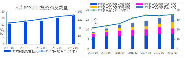截止到2017年9月30日,入庫項目14220個,總投資額17.8萬億元,進(jìn)入執(zhí)行階段項目6778個,總投資額10.1萬億元,落地率為35.2%。
