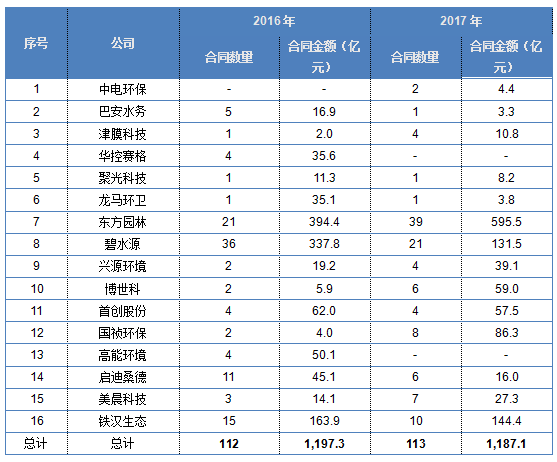 2016-2017年全國PPP項目持續(xù)放量,上市公司也在這個PPP浪潮中充分享受行業(yè)紅利。2016年全年上市環(huán)保公司新簽PPP訂單數(shù)量112個,總金額1197.3億元;截止到去年11月15日,2017年已新簽PPP訂單113個,總金額為1165億元。