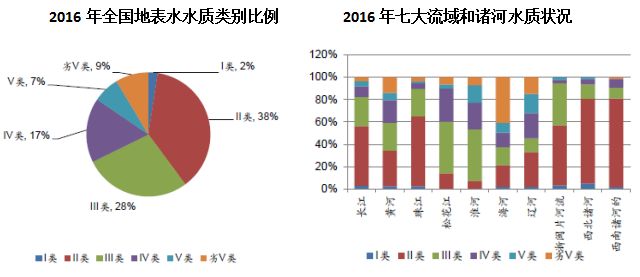 根據(jù)《2016年環(huán)境狀況公報》公布的數(shù)據(jù),地表水方面,1940個國考斷面中,劣Ⅴ類水占比8.6%,Ⅳ、Ⅴ類水累計占比23.7%,水質(zhì)堪憂,且我國水資源分布不均衡,北方呈現(xiàn)生態(tài)型缺水疊加污染性缺水。2015年3月國務(wù)院出臺水十條,確立的目標(biāo)是到2020年,全國水環(huán)境質(zhì)量得到階段性改善,京津冀、長三角、珠三角等區(qū)域水生態(tài)環(huán)境狀況有所好轉(zhuǎn)。