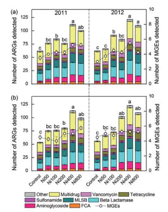 抗生素對細菌感染、致病微生物感染類疾病的防治具有重要作用,但由此而來的抗性基因的快速增加和傳播也威脅著人體健康??剐曰虻难芯吭桨l(fā)受到學者關注,成為研究熱點。除抗生素選擇產(chǎn)生抗性基因外,環(huán)境中重金屬對抗生素抗性的選擇和傳播擴散具有重要作用。中國科學院生態(tài)環(huán)境研究中心Hu等通過對Ni長期污染土壤誘導的抗性基因進行研究,發(fā)現(xiàn)在長期不同程度Ni污染下,共檢測到149種抗性基因,以多藥和β-內酰胺類抗生素抗性為主,抗性基因的頻率和豐度隨Ni污染程度的增加而升高(圖3);抗性基因與可移動抗性原件具有顯著相關性,表明Ni污染增加了抗性基因的水平轉移,該水平轉移與intI1整合子有關。區(qū)別于以往重金屬的直接毒性風險,該研究闡述了重金屬在土壤環(huán)境中的間接風險-增加抗性基因產(chǎn)生和傳播風險。