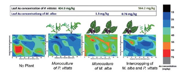 除降低可食作物對重金屬吸收外,在重金屬污染土壤上種植經(jīng)濟作物,阻控重金屬在食物鏈中的傳遞風險,也是污染農田安全利用的措施之一。華中農業(yè)大學Yang等針對重金屬污染土壤研究重金屬耐性經(jīng)濟作物3種種植模式(油菜-向日葵、油菜-花生、油菜-芝麻),對土壤重金屬去除效應和農作物中重金屬濃度的影響進行了研究。結果表明,油菜-向日葵種植模式去除Cd最高,可達459g˙ha-1,去除率為1.98%;利用正己烷提取后作物油符合相應標準,去油后種子殘渣再經(jīng)酒石酸鉀提取后,其重金屬濃度低于飼料標準。經(jīng)濟作物與超積累植物間作,在安全生產(chǎn)的同時也能去除土壤污染物,實現(xiàn)修復目的。但是在超積累植物和其他植物間作體系下,超積累植物對重金屬活化和吸收機制還不清楚,超積累植物是否活化重金屬,增加非超積累植物對重金屬吸收。中國科學院地理科學與資源研究所Wan等開展了As超積累植物蜈蚣草和桑樹間作的研究,探討了邊生產(chǎn)邊修復機制。與單作相比,間作處理條件下蜈蚣草中As濃度顯著增加、桑樹As則顯著降低;對不同處理下土壤As的空間分布分析發(fā)現(xiàn),不論單作或間作處理蜈蚣草根周圍土壤As濃度較低,沒有活化土壤As(圖10),且在間作處理下桑樹葉中As濃度符合國家飼料標準。