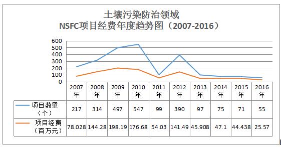 通過統(tǒng)計(jì)2007-2016十年內(nèi)我國國家自然科學(xué)基金的項(xiàng)目數(shù)據(jù),可知土壤污染防治領(lǐng)域的項(xiàng)目經(jīng)費(fèi)在2007-2010年呈穩(wěn)步上升趨勢(shì),2010年申請(qǐng)通過的項(xiàng)目達(dá)峰值547個(gè),2011年有所回落,2012年又激增到390個(gè),之后幾年呈現(xiàn)了下降趨勢(shì),2016年僅通過55個(gè)項(xiàng)目,經(jīng)費(fèi)也隨之下降,如圖9所示。