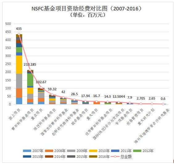 圖10國家自然科學(xué)基金項(xiàng)目資助經(jīng)費(fèi)對(duì)比圖(2007-2016年)