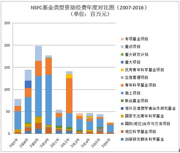 圖11國家自然科學(xué)基金基金類型資助經(jīng)費(fèi)年度對(duì)比圖(2007-2016年)