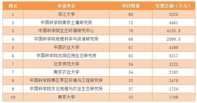 通過項(xiàng)目數(shù)據(jù)分析(見圖10),土壤污染防治領(lǐng)域在面上項(xiàng)目獲得的經(jīng)費(fèi)十年總經(jīng)費(fèi)額度排名第一,共計(jì)4.35億元,青年科學(xué)基金項(xiàng)目排名第二,約為2.13億元。排名第三位的為重點(diǎn)項(xiàng)目,共計(jì)1.02億元。面上項(xiàng)目是相對(duì)于重點(diǎn)項(xiàng)目而言,由于選題廣泛所以占比比其他類型要高。但是由于2013年起基金委出臺(tái)新政策,嚴(yán)格把控項(xiàng)目質(zhì)量。因此導(dǎo)致近幾年資助經(jīng)費(fèi)呈下降走勢(shì)。