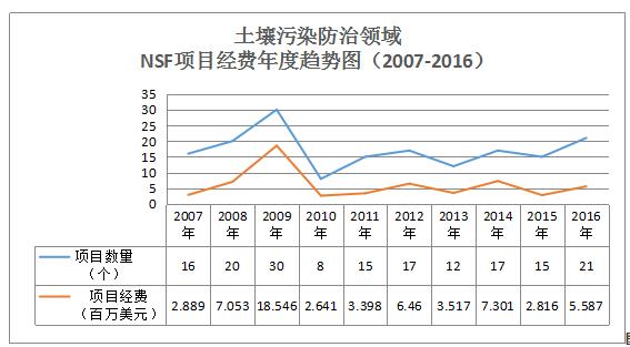 通過項(xiàng)目數(shù)據(jù)分析(見圖12),在土壤污染防治領(lǐng)域,美國國家科學(xué)基金資助經(jīng)費(fèi)在2007年至2009年呈現(xiàn)了穩(wěn)步遞增的趨勢(shì),2009年項(xiàng)目數(shù)量達(dá)到峰值30個(gè)。2010年出現(xiàn)拐點(diǎn),項(xiàng)目數(shù)量下降為8個(gè),2011年又開始回升,之后5年一直較為平穩(wěn),2016年有所增加,達(dá)到21個(gè)。