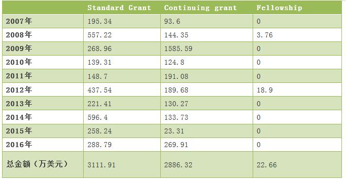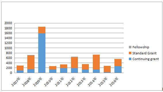 表8美國國家科學(xué)基金項(xiàng)目資助類型經(jīng)費(fèi)表(2007-2016年)