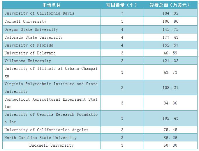 根據(jù)統(tǒng)計(jì),本領(lǐng)域申請(qǐng)年份在2007年至2016年間,共有135個(gè)機(jī)構(gòu)申請(qǐng)了美國國家科學(xué)基金。其中申請(qǐng)數(shù)量超過2個(gè)的機(jī)構(gòu)有14個(gè)獲得經(jīng)費(fèi)約為1496.8萬美元,如表9所示。