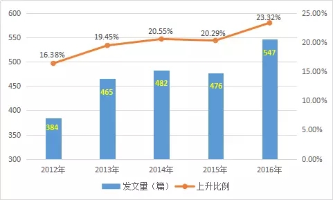據(jù)統(tǒng)計(jì),中國知網(wǎng)收錄的近5年土壤污染防治核心期刊文獻(xiàn)共2345篇,年度發(fā)文量總體呈上升趨勢(shì)(見圖6),上升率由2012年的16.38%升至2016年的23.32%,高出了6.94%,從年度論文數(shù)量的變化中可以看出我國學(xué)術(shù)界對(duì)土壤污染防治的關(guān)注度上升,說明我國科研人員越來越重視土壤污染防治的研究。