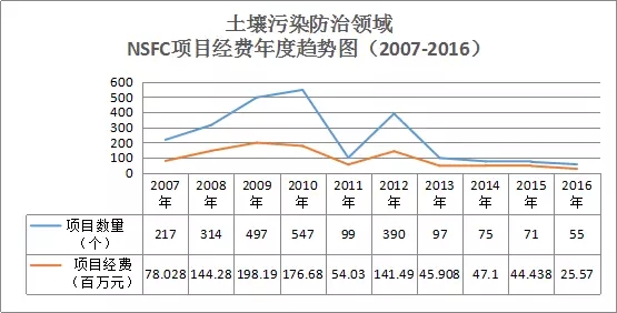 通過統(tǒng)計(jì)2007-2016十年內(nèi)我國國家自然科學(xué)基金的項(xiàng)目數(shù)據(jù),可知土壤污染防治領(lǐng)域的項(xiàng)目經(jīng)費(fèi)在2007-2010年呈穩(wěn)步上升趨勢(shì),2010年申請(qǐng)通過的項(xiàng)目達(dá)峰值547個(gè),2011年有所回落,2012年又激增到390個(gè),之后幾年呈現(xiàn)了下降趨勢(shì),2016年僅通過55個(gè)項(xiàng)目,經(jīng)費(fèi)也隨之下降,如圖9所示。