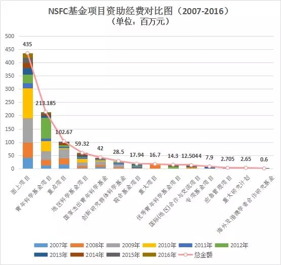圖11 國家自然科學(xué)基金基金類型資助經(jīng)費(fèi)年度對(duì)比圖(2007-2016年)