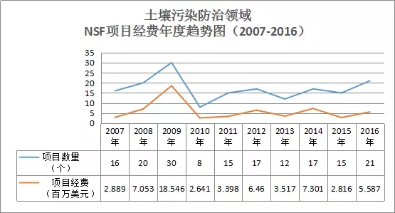 通過項(xiàng)目數(shù)據(jù)分析(見圖12),在土壤污染防治領(lǐng)域,美國國家科學(xué)基金資助經(jīng)費(fèi)在2007年至2009年呈現(xiàn)了穩(wěn)步遞增的趨勢(shì),2009年項(xiàng)目數(shù)量達(dá)到峰值30個(gè)。2010年出現(xiàn)拐點(diǎn),項(xiàng)目數(shù)量下降為8個(gè),2011年又開始回升,之后5年一直較為平穩(wěn),2016年有所增加,達(dá)到21個(gè)。