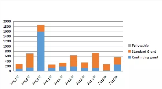 圖12:美國國家科學(xué)基金項(xiàng)目資助經(jīng)費(fèi)年度趨勢(shì)圖(2007-2016)