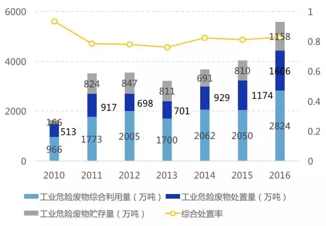 在環(huán)保監(jiān)管力度增強(qiáng),各省均推出省級督查方案背景下,危廢處置剛需再次提升,尤其是要求進(jìn)入規(guī)范渠道處置的量增加。但市場情況是,實際產(chǎn)生量遠(yuǎn)大于統(tǒng)計量(披露16年5347萬噸,預(yù)計實際8000萬噸),低綜合利用處置率(83%),低有效利用率(25%),導(dǎo)致整體危廢的處置供不應(yīng)求。
