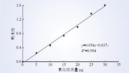 氯化銨標(biāo)準(zhǔn)液吸光度標(biāo)準(zhǔn)曲線如圖2所示。圖2標(biāo)準(zhǔn)液氯化銨含量對應(yīng)吸光度存在以下關(guān)系: