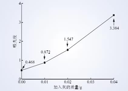盡管網(wǎng)格布點(diǎn)取樣分析法能較為全面地反映電廠氨逃逸狀況,但實(shí)際取樣過程中若操作不當(dāng)會(huì)使少量粉塵顆粒混入樣液中,其可能會(huì)對測試結(jié)果產(chǎn)生影響。為判斷灰分的摻入對靛酚藍(lán)分光光度法測試結(jié)果的影響,分別在標(biāo)準(zhǔn)氯化銨樣品(濃度為1μg/mL,體積為10mL)中添加0.01、0.02、0.04g的飛灰,以模擬粉塵進(jìn)入測試樣品中的狀況。將加入粉煤灰后的各樣品搖勻,震蕩后靜止10min取上清液進(jìn)行分光光度分析,結(jié)果如圖3所示。