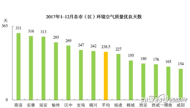 13個(gè)市(區(qū))優(yōu)良天數(shù)為154~331天,平均為238.5天,最多的是商洛331天,最少的是咸陽154天。2017年,西安共收獲優(yōu)良天180天,與2016年相比減少了12天。