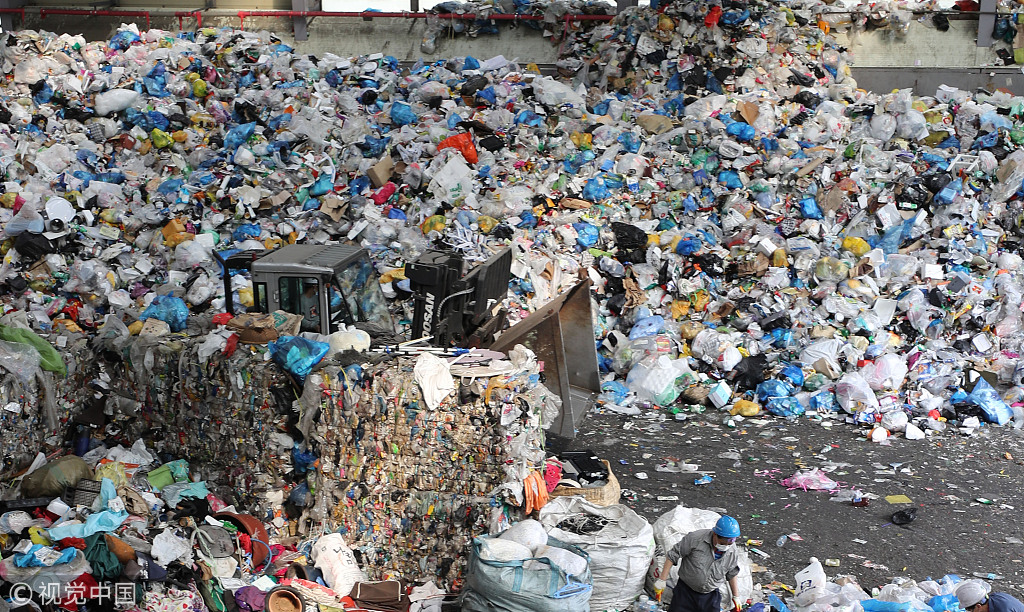 當(dāng)?shù)貢r(shí)間2018年4月2日,韓國(guó)京畿道光明市,回收垃圾堆積成山。(圖源:視覺(jué)中國(guó))