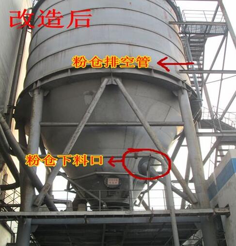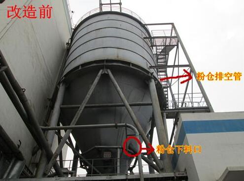 2、經(jīng)過研究,堵管后成品倉頂“跑粉”主要原因是:原有的排空管直徑太小,導(dǎo)致開排放時(shí)壓力高;排空管末端又接在粉倉中上部,尤其是當(dāng)成品倉粉位較高時(shí),粉倉內(nèi)壓力相應(yīng)較高,輸粉管道堵管后,在打開發(fā)送罐排氣閥時(shí),石灰石粉被空氣攪動(dòng)起來,很容易從成品倉頂部噴射出來,嚴(yán)重時(shí)粉倉周邊的馬路全都是粉白一片,即影響了環(huán)境衛(wèi)生,同時(shí)增加了運(yùn)行人員的工作量。經(jīng)過生產(chǎn)部相關(guān)人員探討研究,將排空管末端由中上部直接接至成品倉頂部,排空管直徑由DN50變徑成DN80。2013年9月份完成改造,到目前為止基本杜絕了成品倉“噴粉”的現(xiàn)象。(見圖片)