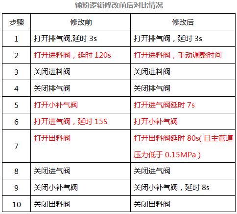 由于進(jìn)料時(shí)間由原來的120s縮短到4-10s,完成一個(gè)輸粉工作循環(huán)由原來的8-10分鐘縮短到現(xiàn)在的6分鐘左右;進(jìn)料量也基本穩(wěn)定,按現(xiàn)在的進(jìn)料時(shí)間4-10s,每次進(jìn)料的料位和進(jìn)料量基本穩(wěn)定,輸粉時(shí)主管道基本都能維持在0.3MPa左右,因此每一小時(shí)約完成8-10輸送工作循環(huán),基本達(dá)到設(shè)計(jì)出力20t/h。按照調(diào)試結(jié)果,將原來邏輯中“打開進(jìn)料閥,延時(shí)120s”進(jìn)行了修改:取消原來的輸粉邏輯中固定的進(jìn)料時(shí)間120s,改成可以由運(yùn)行人員根據(jù)料位、進(jìn)料量和主管道壓力自行設(shè)置的進(jìn)料時(shí)間。由此,全部完成下料口改造和輸粉邏輯改動(dòng),目前氣力輸粉系統(tǒng)運(yùn)行穩(wěn)定,符合設(shè)計(jì)出力。見下圖氣力輸粉邏輯修改前后對(duì)比圖:修改前后主管道壓力曲線圖