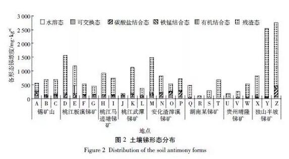 銻的金屬性不強,易形成銻的衍生物(銻化物、氫化物、有機(jī)銻化物等),其毒性的大小不僅與其總量有關(guān),很大程度上還取決于其存在形態(tài)。其中單質(zhì)銻的毒性高于其鹽類,無機(jī)銻的毒性高于有機(jī)銻,+3 價的毒性高于+5 價(+3 價的毒性大約是+5 價的10 倍),且同等價態(tài)銻的毒性還與其化合物的形態(tài)以及晶體結(jié)構(gòu)有關(guān)。銻在土壤中主要以殘渣態(tài)的形式存在,占總銻的比例最高可達(dá)90%,水溶態(tài)含量最低(圖 2)。
