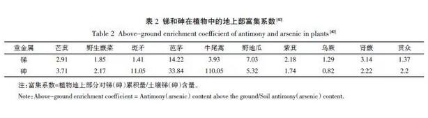 土壤中銻形態(tài)的分布特征會對其在土壤-植物體系中的富集轉(zhuǎn)運能力產(chǎn)生一定影響。相關(guān)研究者比較了蜈蚣草、斑矛、五節(jié)芒、粽葉蘆對砷和銻的轉(zhuǎn)運能力,發(fā)現(xiàn)只有五節(jié)芒和粽葉蘆從根部到地上部(莖/葉)對銻具有較好的轉(zhuǎn)運能力,而4 類植物對砷都表現(xiàn)出了良好的轉(zhuǎn)運能力,說明銻在植物體中的轉(zhuǎn)運能力相對于砷較弱。文吉昌等的研究結(jié)果(表 2)表明,除了個別植物對銻的富集能力大于砷外,其余植物對銻的富集能力均遠(yuǎn)小于砷。也有研究表明,植物地上部的銻含量與根部含量之間沒有相關(guān)性(r=0.19),植物吸收的銻并非單一來自土壤的釋放,還有一部分可能來自大氣沉降,進(jìn)一步表明了銻在植物中具有較弱的富集轉(zhuǎn)運能力。