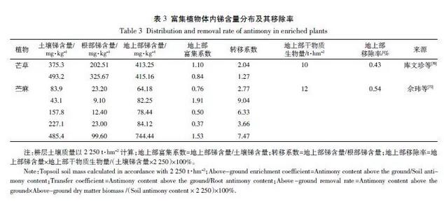 綜上所述,在目前研究較多的2 種銻富集植物中,雖然對銻均有較好的富集效果,但整體移除率不高(移除率基本≤1%),遠(yuǎn)低于其他重金屬的富集植物在土壤污染修復(fù)中的移除效果(移除率基本≥10%),實際應(yīng)用潛力不高,尤其是周期較短的農(nóng)田土壤修復(fù)中。
