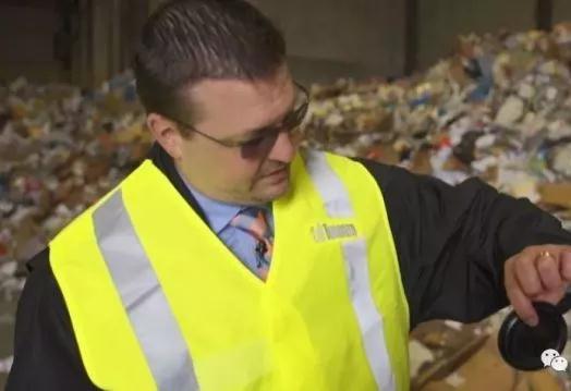 McKay用一個大耙子從垃圾堆里將不可回收的物品扒出來, 其中包括一個裝有狗糧的袋子以及一個印有可回收字樣的黑色塑料咖啡杯蓋, "無論從外觀、手感還是標(biāo)識看, 它都是可回收垃圾,然而它不是!"