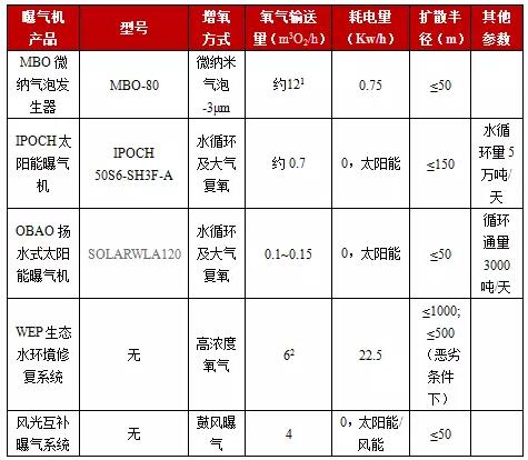 在水環(huán)境治理中,筆者認為衡量增氧曝氣技術產品性能的參數主要為:氧氣輸送量、耗電量及擴散范圍。據筆者所知我們不妨以均具有專利技術并已得到應用的MBO微納氣泡發(fā)生器、IPOCH太陽能曝氣機、OBAO揚水式太陽能曝氣機、WEP生態(tài)水環(huán)境修復系統(tǒng)、風光互補曝氣系統(tǒng)來進行對比。