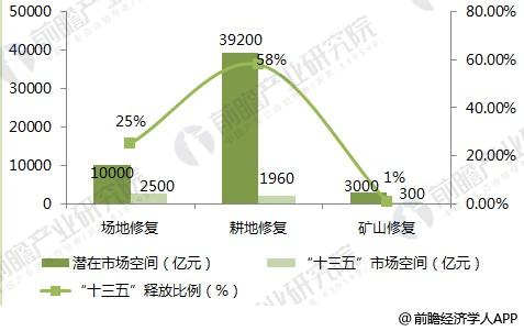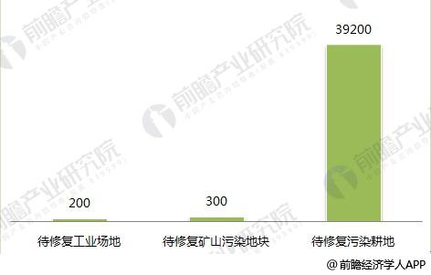 前瞻產(chǎn)業(yè)研究院發(fā)布的《2018-2023年中國(guó)生態(tài)修復(fù)行業(yè)市場(chǎng)前瞻與投資戰(zhàn)略規(guī)劃分析報(bào)告》顯示,根據(jù)國(guó)家“到2020年現(xiàn)有位于城鎮(zhèn)內(nèi)人口密集區(qū)域的危化品生產(chǎn)企業(yè)全部啟動(dòng)搬遷改造”的指標(biāo),可以推測(cè)我國(guó)有待修復(fù)的工業(yè)場(chǎng)地存量200萬畝,根據(jù)招投標(biāo)現(xiàn)狀來看,每塊地修復(fù)成本從百萬至千萬甚至上億不等,保守估計(jì)以每畝地20-50萬元價(jià)格來估算,則場(chǎng)地修復(fù)市場(chǎng)空間將達(dá)到1萬億元;我國(guó)的待修復(fù)礦山污染地塊在300萬畝左右,保守估計(jì)以每畝地5-10萬元左右價(jià)格垃圾進(jìn)行估算,則礦山修復(fù)市場(chǎng)空間將達(dá)到3000億元左右;待修復(fù)的污染耕地面積約為3.92億畝,每畝耕地修復(fù)價(jià)格以1萬元為計(jì)算,則污染耕地修復(fù)市場(chǎng)空間為3.92萬億。總計(jì)來看,這三類待修復(fù)土壤潛在市場(chǎng)空間達(dá)5.22萬億元。