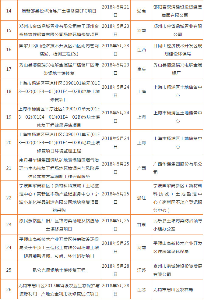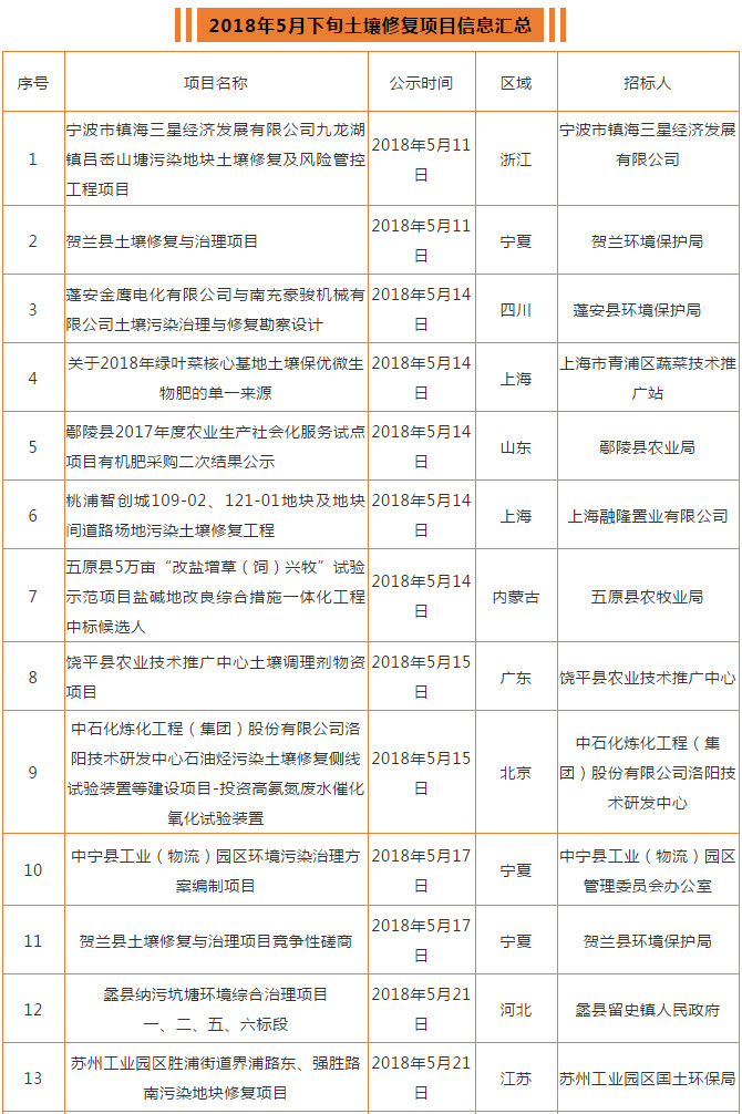我國土壤修復(fù)市場前景廣闊,很多土壤修復(fù)項目也在如火如荼地進(jìn)行,5月下旬土壤修復(fù)市場又有哪些項目呢?