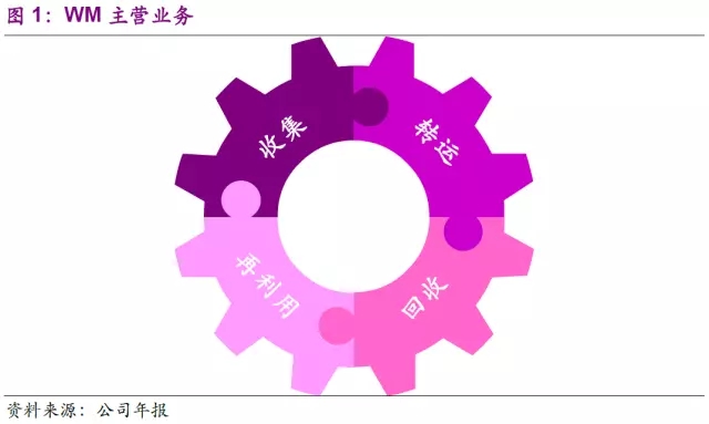 美國廢物管理公司 (Waste Management, Inc.,以下簡稱WM)成立于1968年,經過多年的成長和發(fā)展,從數個小型垃圾收集站逐步發(fā)展為全球固廢的絕對龍頭。公司在目前在美國和加拿大地區(qū)為市政、商業(yè)、工業(yè)及居民客戶提供廢品管理服務,包括收集、轉運、再利用、資源回收服務。