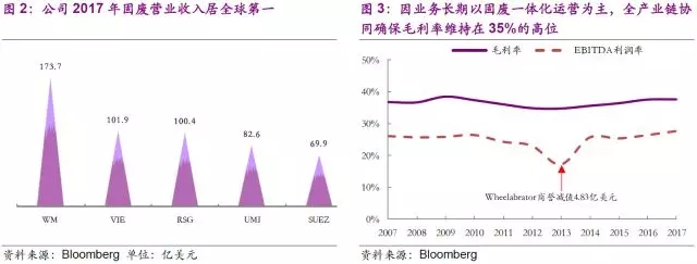 截止2018年5月23日,WM市值達357億美元。公司2017年垃圾處理量高達1.13億噸,實現營業(yè)收入145億美元,EBIT和EBITDA分別為26和40億美元。公司2017年固廢營業(yè)收入居全球第一,領先第二名威立雅達70%,而這一切都建立在公司僅在美國和加拿大運營的基礎上,充分展現出公司在固廢領域的絕對統(tǒng)治力。