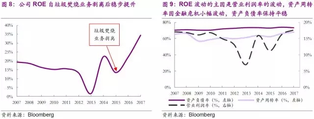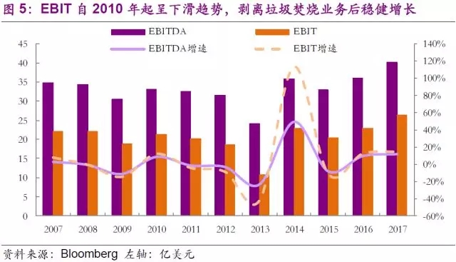由于金融危機和垃圾焚燒電價下降等多重因素共同作用,公司ROE自2007年起逐步走低。隨著多個長期垃圾焚燒發(fā)電合同的到期,公司需要重新按照市場價格續(xù)簽合同,經過慎重評估后,公司在2013年確認了高達4.83億美元的Wheelabrator公司商譽減值,在營業(yè)收入略有增長的情況下,將公司EBIT從2012年的18.5億美元直線拉低至10.8億美元,帶動公司營業(yè)利潤率跌破10%,ROE也降到不足2%。雖然2014年Wheelabrator營業(yè)收入有所增長,但是站在公司長期戰(zhàn)略性角度考慮,垃圾焚燒業(yè)務已不再屬于公司核心業(yè)務。公司最終于2014年正式出售Wheelabrator子公司及其全部垃圾焚燒業(yè)務。經過2015年的剝離陣痛后,公司營業(yè)利潤率和ROE重新回到歷史高位。