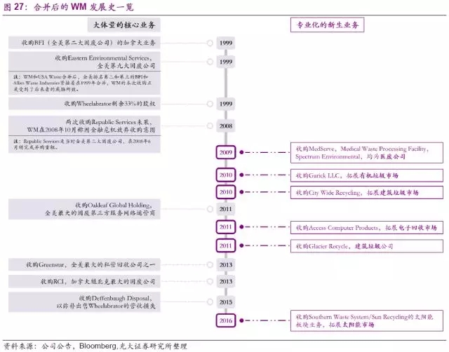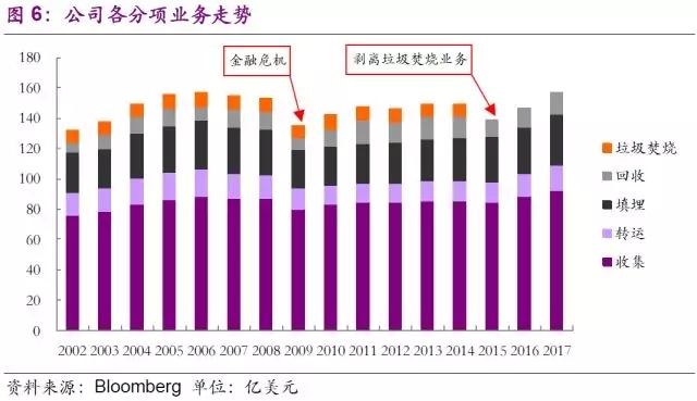 公司核心業(yè)務在美國已占據領先地位,合并后,公司先是迅速拿下了BFI(全美第二大固廢公司)的加拿大全部業(yè)務,緊接著又收購了全美第九大固廢公司Eastern Environmental Services。公司在穩(wěn)固開展自有優(yōu)勢垃圾收運業(yè)務的基礎上,先是在1999年收購公司垃圾焚燒領域支柱Wheelabrator的剩余33%股權,隨后分別在2011年、2013年收購全美最大的固廢第三方服務運營商Oakleaf Global Holding和私營回收公司Greenstar,穩(wěn)固提高公司在垃圾收運、垃圾轉運、以及垃圾回收等核心業(yè)務上的領先地位。