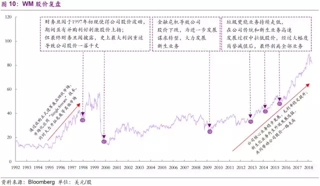 公司的發(fā)展之路并非一帆風順。通過1970—1990年間的大肆并購擴張,從傳統(tǒng)的收集轉運領域拓展到回收、危廢等市場,公司成功成為全球第一的固廢公司。但因擴張過快、戰(zhàn)略不當等因素,公司在1999年被市值和營業(yè)收入遠小于自己的USA Waste Services Inc并購,財務丑聞事件最終被披露也使得公司股價一落千丈。合并后的公司并沒有從此一蹶不振,而是通過不斷優(yōu)化公司經營策略,聚焦核心主業(yè)的同時大力發(fā)展新生化業(yè)務,引領公司一路走高至目前的近400億美元市值。