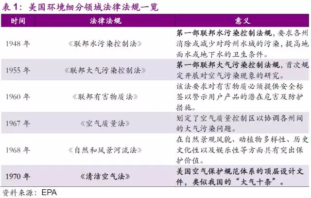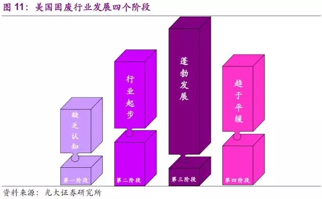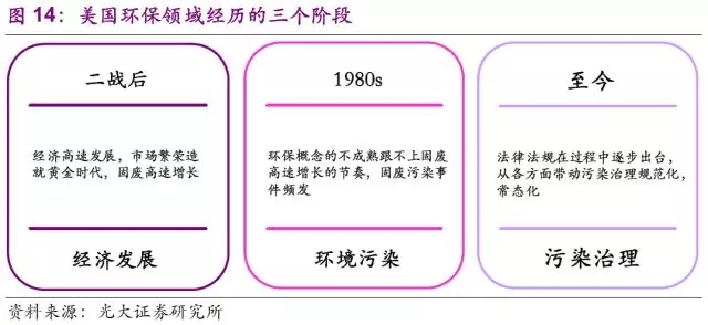 和其他發(fā)達國家一樣,美國在環(huán)保領域同樣經歷了“經濟發(fā)展—環(huán)境污染—污染治理”這一過程,而這三者之間的脈絡基本對應固廢行業(yè)的第三,四階段。在這兩個階段之前美國出臺的一系列法規(guī),先后幫助固廢行業(yè)的完善成長以及促使其朝著平穩(wěn)可持續(xù)健康的發(fā)展業(yè)態(tài)前進。