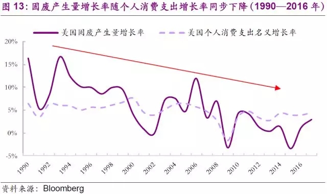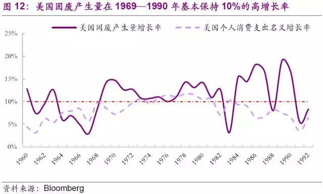 二戰(zhàn)后,美國新技術革命的推動(主要原因)與國民經濟的軍事化(越南戰(zhàn)爭)極大地刺激了經濟的增長。利用戰(zhàn)后經濟優(yōu)勢地位和國外廉價資源(石油等),美國的現代跨國公司大力拓展世界市場,極大地獲取高額利潤,使得美國國內經濟持續(xù)發(fā)展,西部和南部呈現繁榮之象并且造就了一個黃金時代。高速發(fā)展的黃金時期,美國居民生活水平持續(xù)提高,個人消費增速明顯,進而帶動固廢量持續(xù)走高,這段時期也是固廢行業(yè)蓬勃發(fā)展的第三階段。
